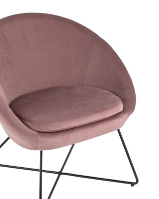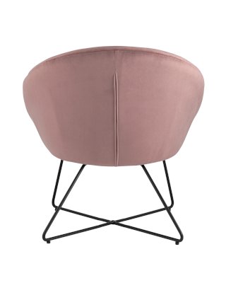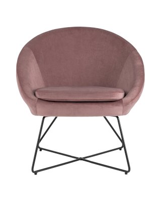 Широкая спинка плавно переходит в удобные подлокотники. Перекрещенные ножки изготовлены из металла и добавляют креслу оригинальности. Для дополнительного комфорта в кресле есть мягкое плотное сиденье. В качестве обивки используется велюр, приятный на ощупь. Металлический каркас добавляет устойчивости и выдерживает нагрузку до 120 кг.