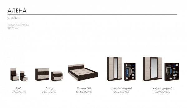 Модульная спальня Алена Венге/Дуб молочный (Империал) - за 34 760 руб. в Павловском Посаде. Купите на сайте pavlovskii-posad.onlinemarketmebeli.ru или по телефону 8(800)505-30-63 уже сегодня! Уточнить наличие, комплектацию, актуальную цену можно бесплатно у менеджера ежедневно. Закажите Модульная спальня Алена Венге/Дуб молочный (Империал) до конца акции! Доступна покупка в кредит, рассрочку. Доставим со склада или на заказ.