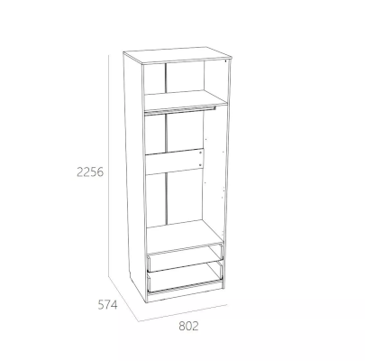 Внутри модуля предусмотрены овальная штанга для одежды на вешалках. Широкая антресольная полка подойдёт для размещения коробок и аксессуаров. Плавный и бесшумный ход, у двух выдвижных ящиков, обеспечивают шариковые направляющие полного цикла. Благодаря им, равномерно распределяется вес содержимого ящиков. Классические глухие фасады надежно защитят содержимое шкафа от влаги и пыли.