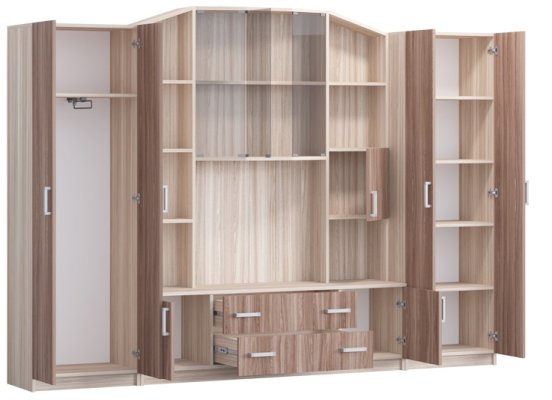 Имеет два больших шкафа, несколько вместительных выдвижных ящиков, расположенных внизу и в середине стенки, а также небольшой сервант, тумбу и место под телевизор.