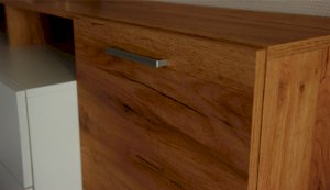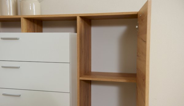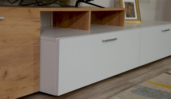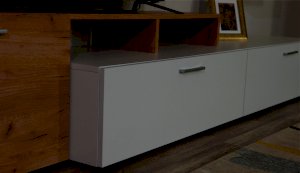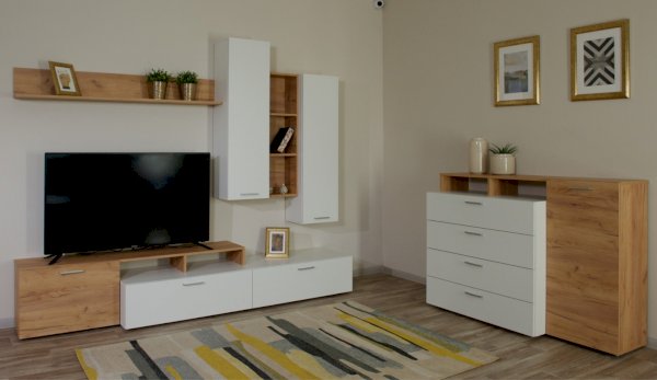 Стенка выполнена с учетом новейших дизайнерских решений - сочетание теплого оттенка дерева с четкой древесной текстурой и белого цвета, разноуровневые модули, скрытая крепежная фурнитура. Все эти элементы создают визуальную легкость и компактность стенки. Мебель легко устанавливается и регулируется по высоте. Широкая тумба для ТВ позволит разместить телевизор любой диагонали, полки послужат для размещения других медиа устройств. Стенку дополняет вместительный комод с ящиками полного выдвижения. Мебель выполнена из высококачественных экологичных материалов.
