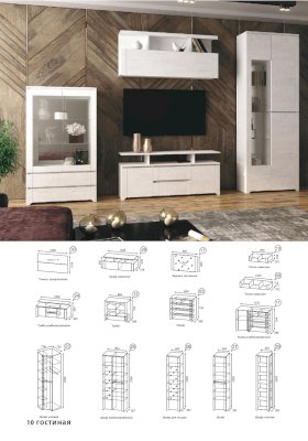 В центре модульного набора будет отлично смотреться ТВ-секция с навесной полкой. Шкафы-серванты с зеркальными дверцами позволят Вам расположить сервиз, предметы декора и книги. Вместительный комод с навесным зеркалом станут идеальным дополнительным вариантом для хранения одежды, белья и других личных вещей.