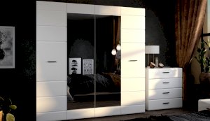 Распашной 4х дверный шкаф для одежды Йорк выполнен в современном стиле, сочетает в себе функциональность и эффектный внешний вид: строгая горизонтальная фрезеровка фасадов, контрастного черного цвета ручки и задняя стенка из ХДФ, элегантный белый цвет. Блеск глянцевых фасадов High Gloss из МДФ и зеркала наполняют комнату светом, делают ее просторнее. Внутри предусмотрены вместительные секции для белья и отделение со штангой. Мебель выполнена из экологически безопасных и надежных материалов.