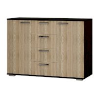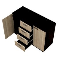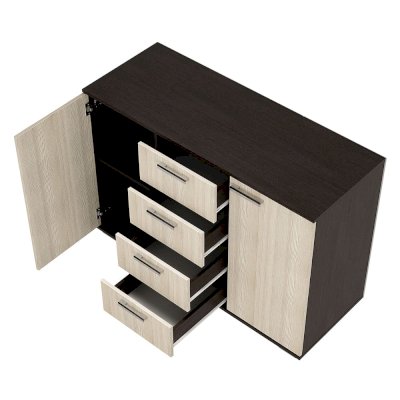 Комод Стандарт №2 – прекрасный выбор для спальни или гостиной! Данная модель состоит из четырех центральных выдвижных ящиков, а также двух боковых секций с распашными дверцами. Комод позволит вместить большое количество вещей, одежды и любых мелочей.