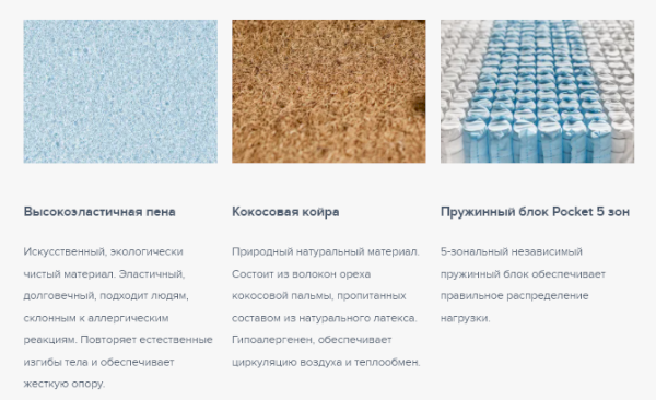 В основе матраса блок независимых пружин Pocket 5 Zone, имеющий 5 зон различной степени упругости, плотностью 512 пружин на спальное место. Благодаря использованию проволоки различного диаметра каждая из зон обеспечивает правильную поддержку позвоночника и правильное распределение нагрузки. Кокосовая койра в комбинации с высокоэластичной пеной Foam обеспечивают среднюю жесткость матраса с обоих сторон.Чехол выполнен из приятного турецкого трикотажа с вискозой в составе, простеганного на объемном гипоаллергенном синтепоне.
