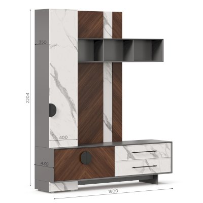 - Модуль скомбинирован из наборной панели, шкафа одностворчатого, тумбы для ТВ и открытых полок