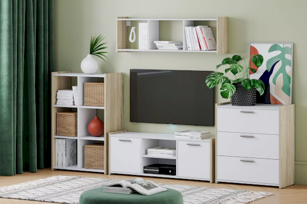 Тумба ТВА Симпл выполнена в скандинавском стиле и имеет малые габариты, что делает ее функциональной и стильной. Характерная особенность тумбы - комбинация открытых полок и ящиков. На полках можно разместить предметы декора и книги, а в ящиках за распашными дверями расположить все необходимые мелочи.