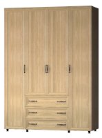 Компактный, но вместительный распашной шкаф с тремя ящиками, за дверью полки для одежды и белья. Вместительные выдвижные ящики полного выдвижения глубиной 400 мм. В двух секциях штанга под одежду.
