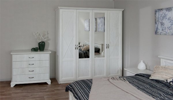 Вместительный комод Лорена в стиле неоклассика создает уютную атмосферу в интерьере гостиной или спальни. Белые фасады с фактурой и рисунком натурального дерева наполняют комнату светом, делают ее просторнее. Металлические ручки цвета состаренного серебра придают изысканность, а фигурные ножки и декоративный профиль крышки подчеркивают стилистику коллекции. В выдвижных ящиках на телескопических направляющих удобно хранить любые предметы одежды и личные вещи. Выполнен из экологичных материалов.