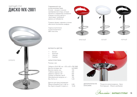 Барный стул ДИСКО WX-2001 с невысокой спинкой непременно придется вам по вкусу и создает в кафе неповторимую атмосферу. Основа барного стула ДИСКО WX-2001 - мощная стальная хромированная опора, которая крепится к надежному основанию в форме плоского диска и гарантирует требуемый уровень устойчивости. Плавные формы сидения и спинки обеспечат посетителю комфорт.