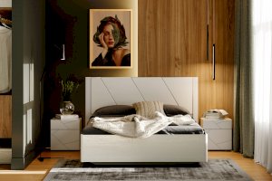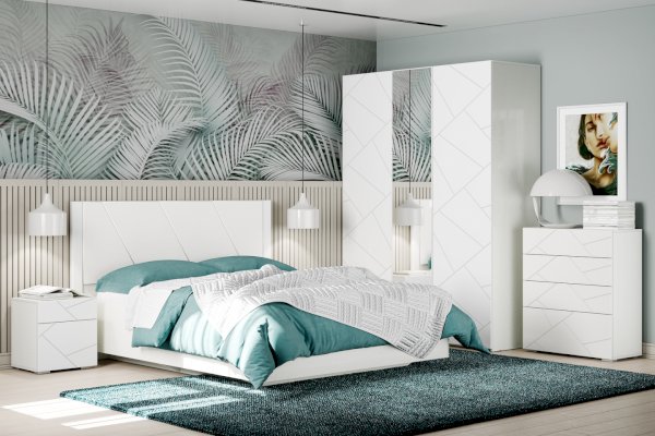 Все ручки в мебели — скрытые. Элементы изголовья кровати обтянуты мягким кожзамом, а оригинальное основание с эффектом «парения» преображает интерьер. В выдвижных ящиках используется система скрытых направляющих Quadro stop control, что позволяет легко и почти бесшумно использовать ящики. Большие зеркала шкафа визуально расширяют пространство комнаты и сделают утренние и вечерние ритуалы еще приятнее.