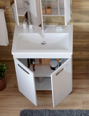 2 дверцы; 1 полка ЛДСП; ручка врезная металлическая хромированная, опоры квадратные регулируемые.