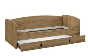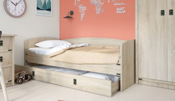 Кровать-тахта – со скругленным изголовьем и высокой спинкой имеет дополнительное спальное место, с помощью множества роликов его легко выдвинуть, можно использовать как ящик для белья. Мягкая кромка 2мм защищает края кровати от повреждений и сколов. Украшением служат стилизованные металлические ручки MARINE бронзового цвета и декоративные элементы в тон. В комплекте с декоративным матрасом и подушками превращается в молодежный диван. Пользоваться кроватью может взрослый и ребенок любого возраста, так как она имеет размеры стандартной кровати 90х200см, устойчивую конструкцию и нейтральный для интерьера цвет. Идеально компонуется со всеми модулями системы Валенсия.