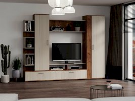 Гостиная «Дарина» украсит любой интерьер и сделает его современным и уютным. Стенка очень функциональна, включает в себя шкаф с выдвижной штангой, шкаф с полками и откидными дверцами, тумбу ТВ с 2 секциями с откидной дверцей и 2 нишами, секцию с открытыми полками. Удобная ниша под TV, а открытая полка под нишей позволит хранить различные аксессуары. Пластиковые ручки в цвете металл имеют матовое покрытие и небольшой вес, тем самым зрительно не нагружают фасад мебели.