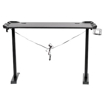 Поверхность стола не скользкая, устойчивая к загрязнениям, мелким царапинам. На столешнице можно расположить все необходимое: письменные принадлежности, документы, игровые девайсы, настольную лампу.  В конструкции предусмотрено 2 отверстия для проводов, а также подстаканник и крючок для наушников.