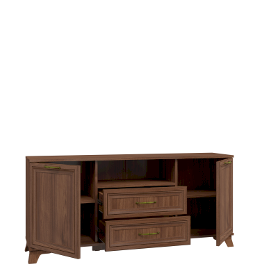 Тумба имеет широкую столешницу и отлично подходит для телевизоров, у которых большая диагональ экрана. Оснащена выдвижными ящиками для хранения различных мелочей.