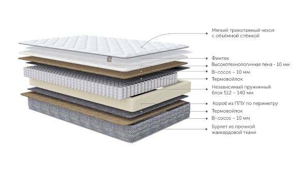 Наполнитель: Fintek, ППУ высокотехнологичный 10 мм, Bi-cocos 10 мм, Термовойлок, Независимый пружинный блок