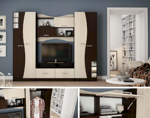 Гостиная «Рио» делает обстановку менее традиционной и более раскованной. Уникальный дизайн удивляет и завораживает! Оригинальное цветовое решение, несколько плавных линий и небольшие зеркальные вставки превращают самую обычную модель в центральный элемент интерьера. Безупречный внешний вид гарнитура обеспечивает ламинированное покрытие естественных оттенков с хорошо различимой текстурой натурального дерева.