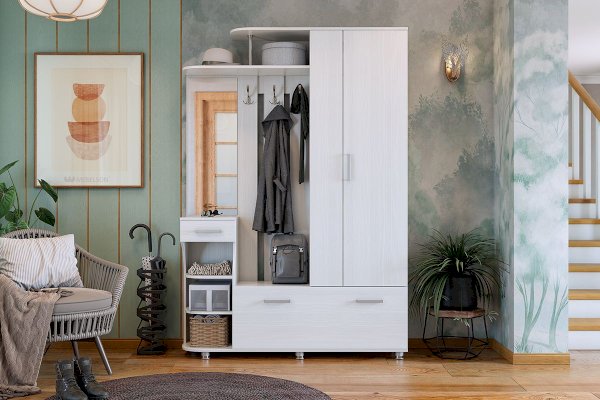 Прихожая «Барселона-2» обладает испанским характером – она стильная и добродушная. Вы можете разместить одежду в шкафу с выдвижной штангой или на вешалке с крючками, обувь сложить в нижний шкаф, шляпки на специальную верхнюю полку, а мелочи в выдвижной ящик и открытые полки. Есть зеркало.