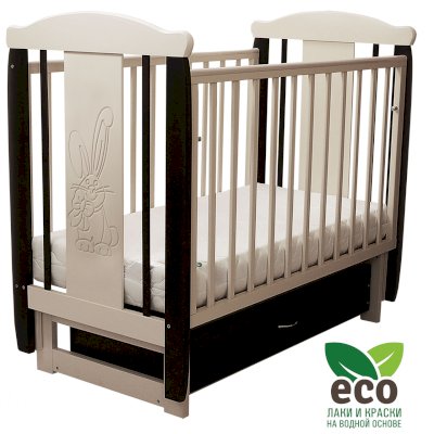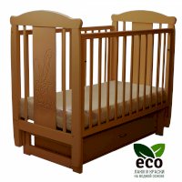 Кроватка декорирована фрезерным рисунком "Заяц с бантом". Уникальные фрезерные рисунки размером от 50 см на обеих спинках.