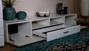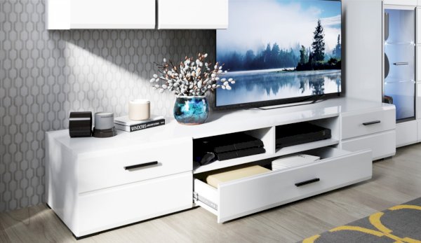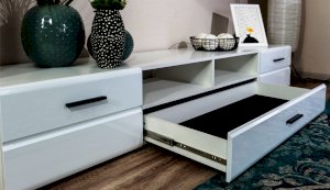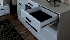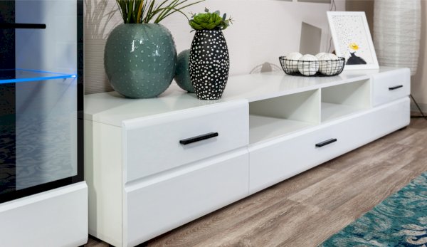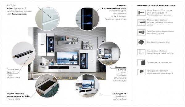 Модульная система Йорк выполнена в стиле минимализма. Строгие, лаконичные линии подчеркивают элегантность комплекта. Белый цвет мебели с деталями глубокого черного визуально сделает комнату светлее, просторнее и позволит составить безупречный по стилю комплект мебели. Сочетание глянцевой и стеклянной поверхностей, открытых полок создадут уютную обстановку и позволят украсить убранство комнаты приятными мелочами и разместить любимые книги и фото. Светодиодная подсветка придаст индивидуальность Вашей мебели. А широкая тумба для ТВ с выдвижными ящиками на телескопических направляющих позволит удобно разместить телевизор любой диагонали и другие медиаустройства Модульная система позволит подобрать по размеру вариант именно для Вашей комнаты, не оглядываясь на фиксированный размер, как в других стенках. Мебель выполнена из экологически безопасных материалов.