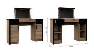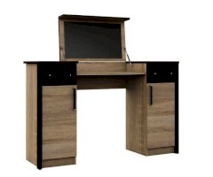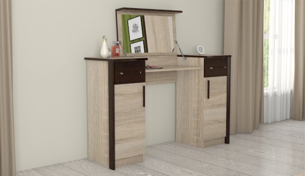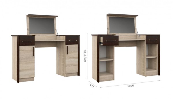 Туалетный стол с откидной столешницей - отличное место для хранения косметики. В тумбах расположены выдвижные ящики, в которых легко разместятся приспособления для сушки и укладки волос. Контрастный профиль из МДФ 22мм по краям модуля и крышка стола с безопасными скругленными краями. Кромка цвета венге подчеркивают древесную текстуру и рисунок светлого дуба сонома. Отлично сочетается по стилю с пуфом Эшли.