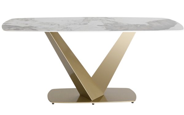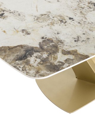 Столешница сочетает в себе прочную керамику, покрытую слоем закалённого стекла для практичности и стиля. Материалы устойчивы к перепадам температуры, к чрезмерной влаге, любые загрязнения легко устранить. Поверхность повторяет рисунок изысканного мрамора, излучая комфорт и спокойствие. Металлический каркас золотого матового цвета из двух объёмных балок образуют простую и надежную конструкцию. Роскошное сочетание цветов позволяет подобрать к столу любые комплекты стульев в современном стиле.